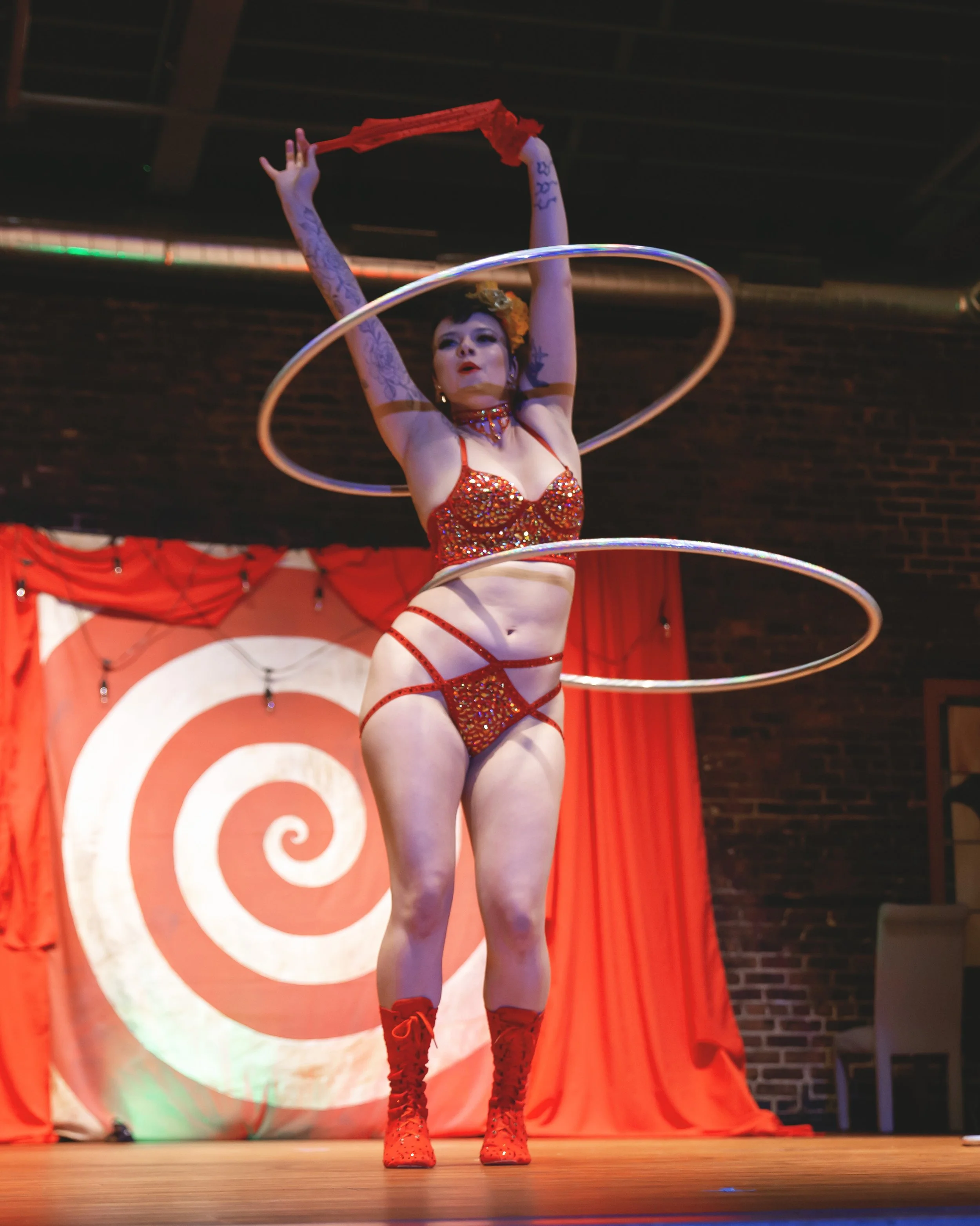 Known as the Spinning Seductress, Meg Mesmeric (she/her) is a Chicago-based burlesque and variety artist who has been actively performing since 2022. Her movement style ranges from slow burn and sexy to fast paced and a little weird. You’re just as likely to catch her grinding on a chair to Billie Eilish as you are stripping to the Cramps while dressed as the Creature from the Black Lagoon. Whatever she is cooking up, she’s sure to hypnotize your heart and mesmerize your soul.